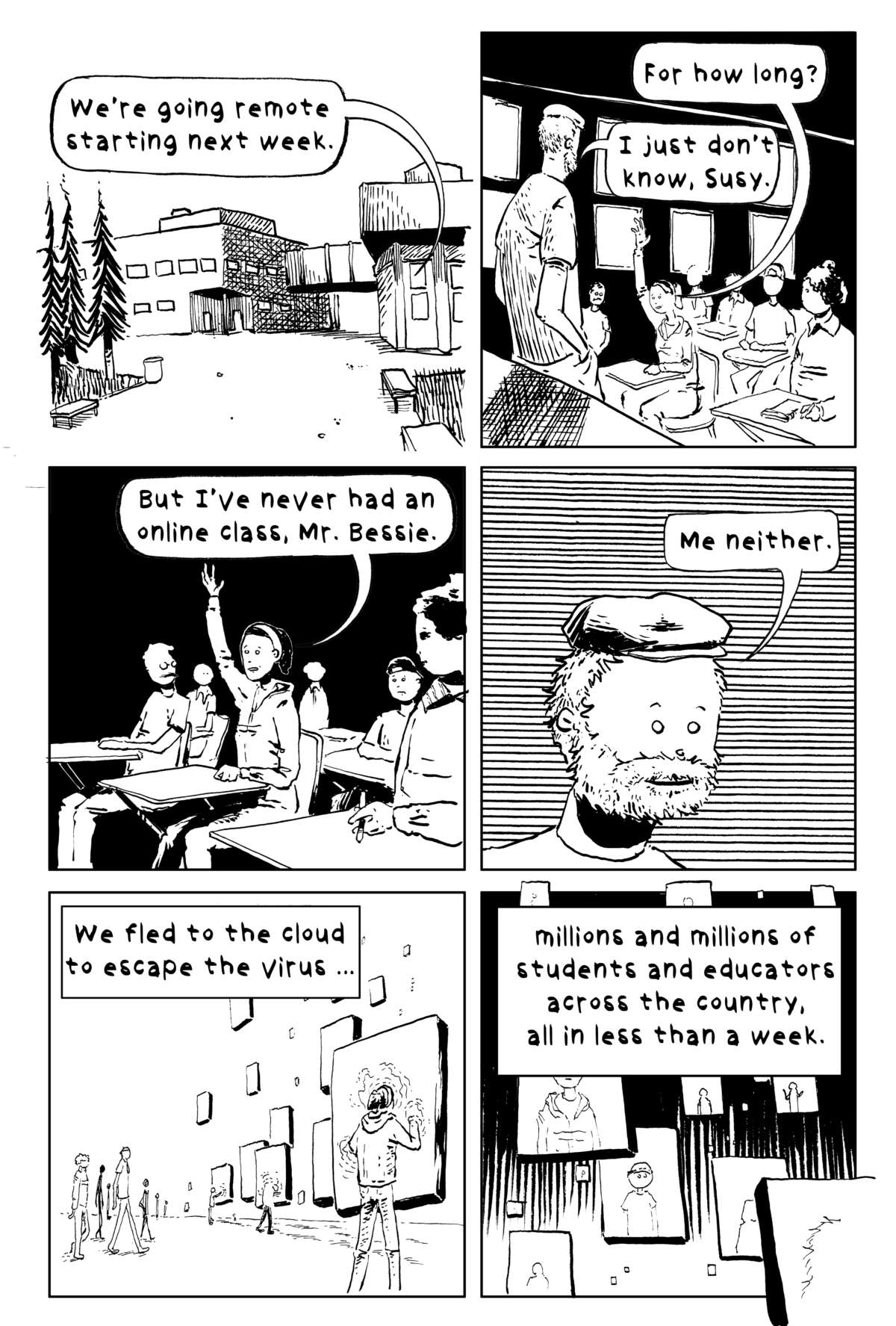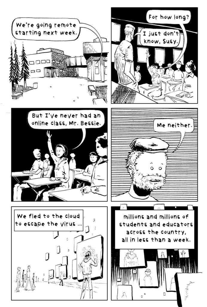 “Adam Bessie’s engaging personal reflection on teaching in Zoom times is made palpable by Peter Glanting’s smart use of the comics form and strikingly rendered metaphorical imagery. Together they capture the human energy in a classroom, the profound loss from its disruption, and ask readers to consider the promise of education in a new light.” —Nick Sousanis, Associate Professor in Comics Studies at San Francisco State University, author of Unflattening